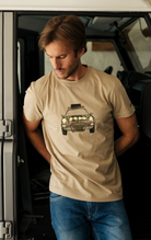 Inspired by the Dakar Rally, this t-shirt features a heavily modified Porsche 911, similar to those racing across the desert. The faded colours really go with the “Gravel Series” aesthetic, recreating that dusty, vintage look without the worn-out fit of a pre-loved t-shirt!